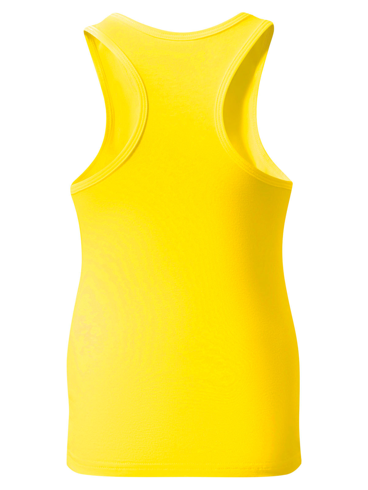 Жёлтая спортивная майка борцовка для художественной гимнастики. Декорирована стразами ювелирного блеска и тематическим анималистическим принтом на груди – гимнастки. Майка лёгкая, в меру тонкая – в ней не жарко, облегающая, приталенного фасона, представлена широким размерным рядом. Изготовлена из высококачественного хлопкового полотна с небольшим добавлением эластана. Полотно не скатывается, не линяет, достаточно долго держит форму. Модель функционального покроя, с открытыми лопатками, разрабатывалась нами для спортивной фигуры балерин. Предназначена как для регулярного использования на занятиях по физической подготовке в зале хореографии и балета, так и для повседневной носки.